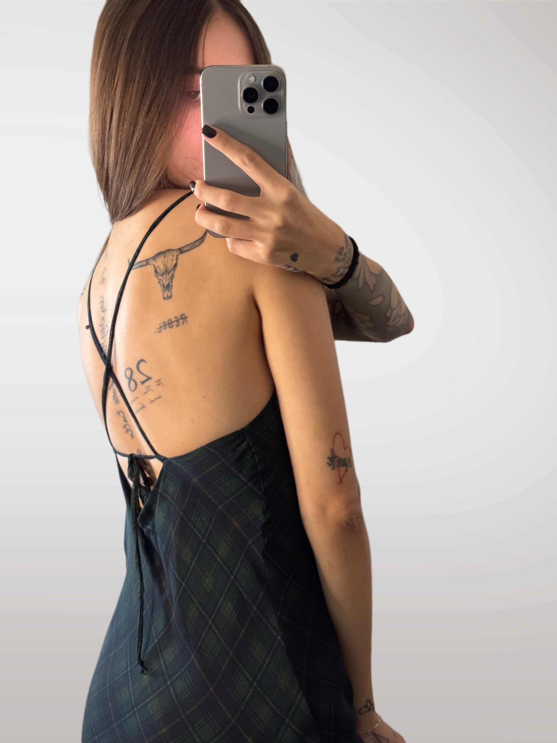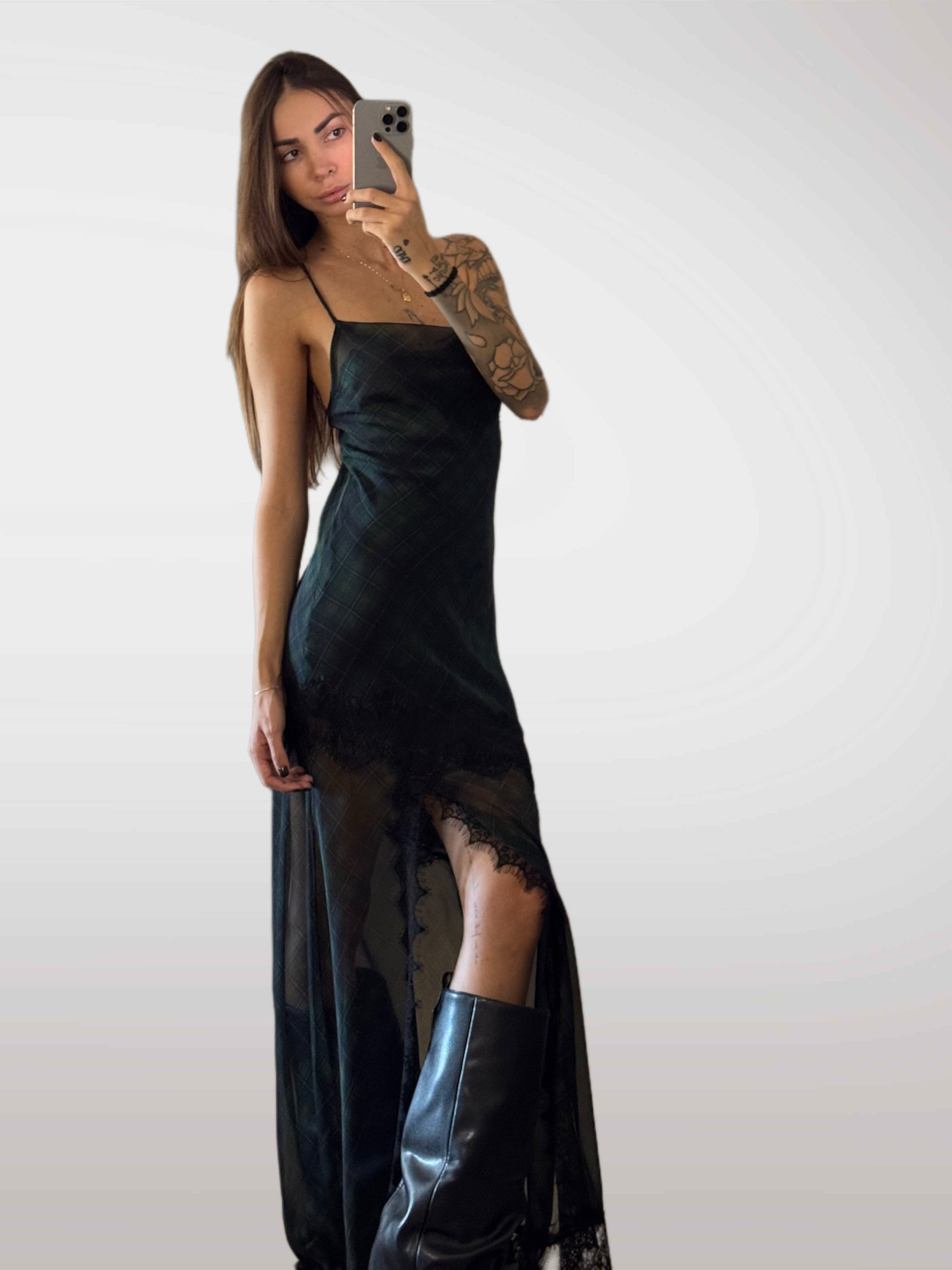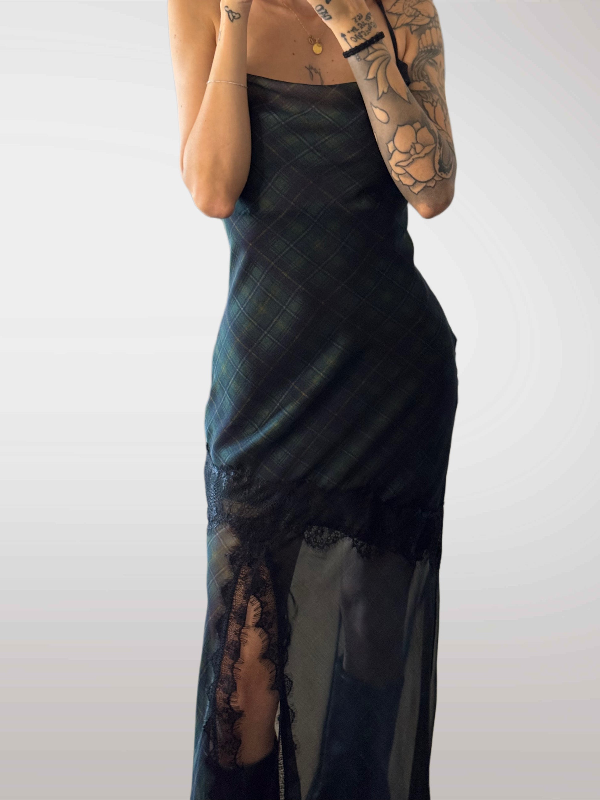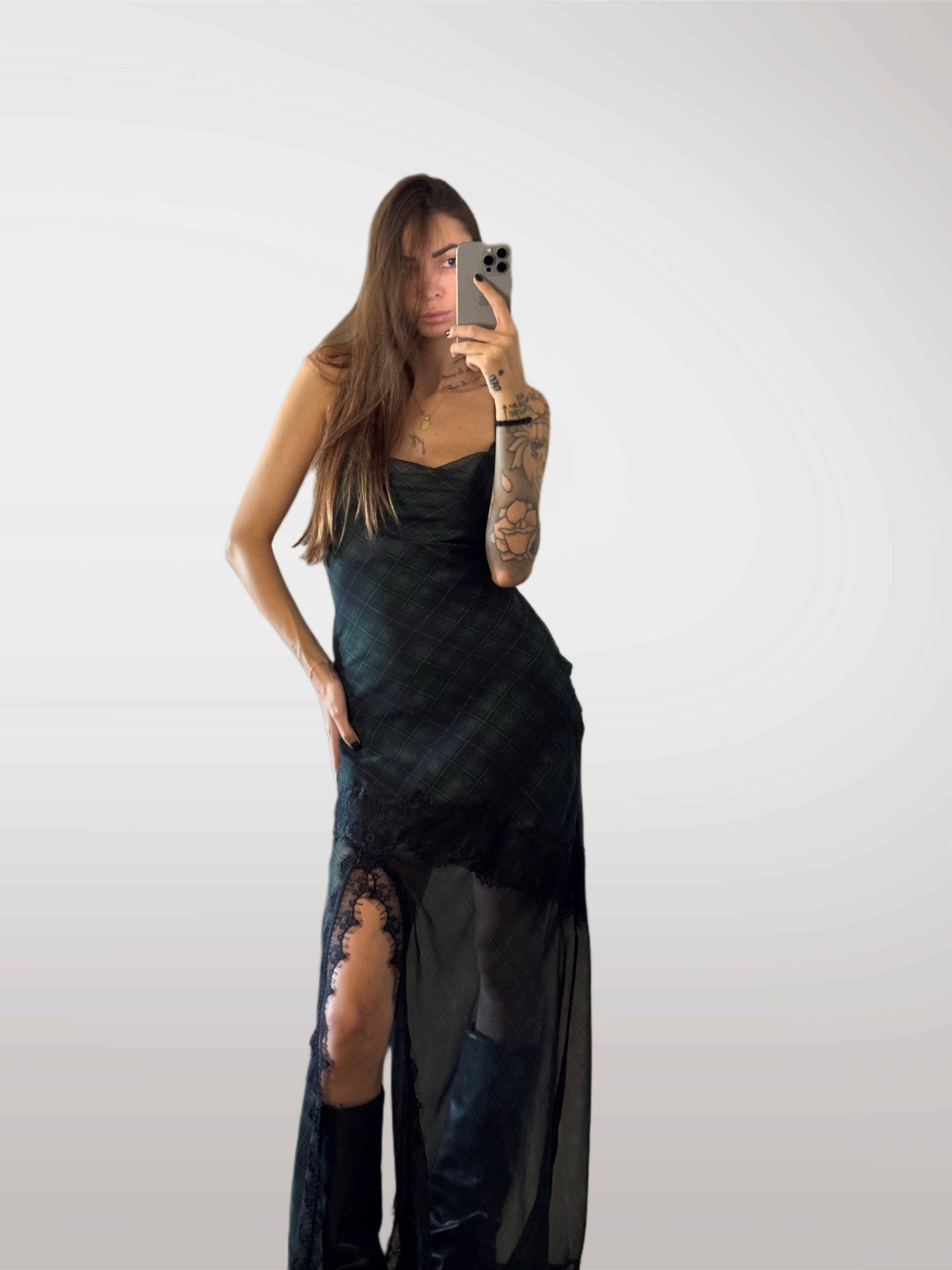 Abito a quadri foderato per poi lasciare le gambe in trasparenza,con spacco e pizzo