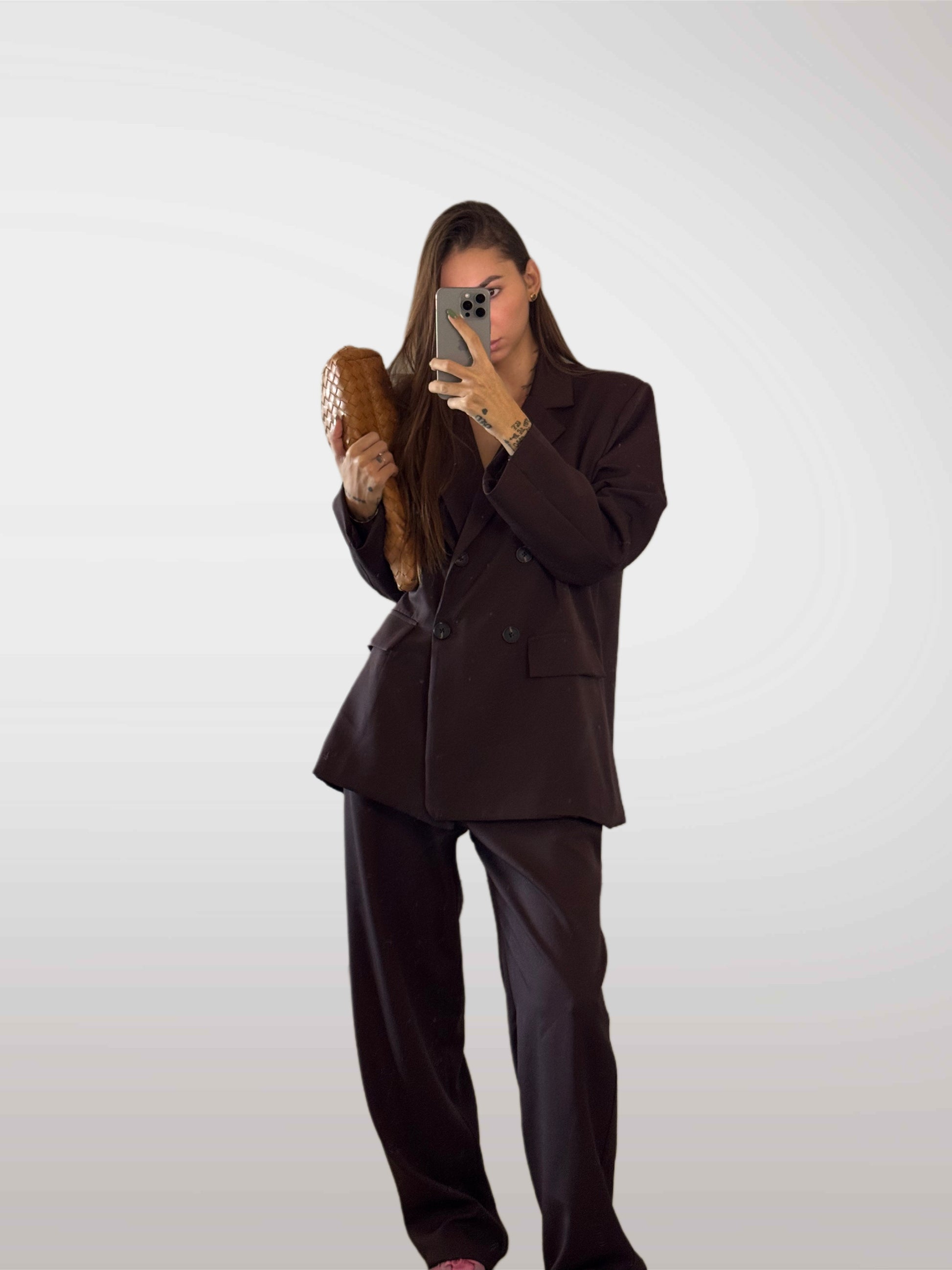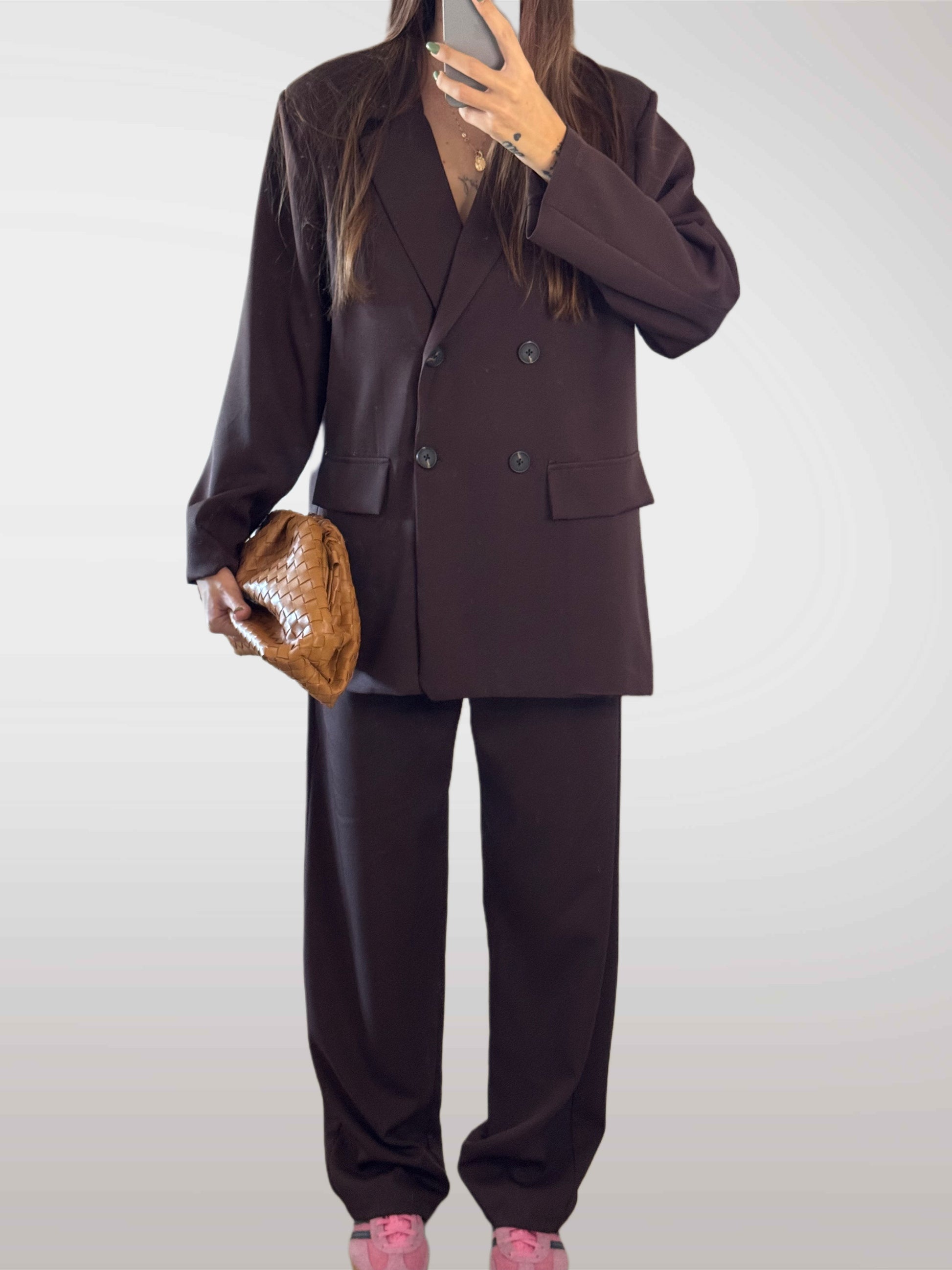 Coordinato con giacca doppiopetto e pantalone con molla sul retro.