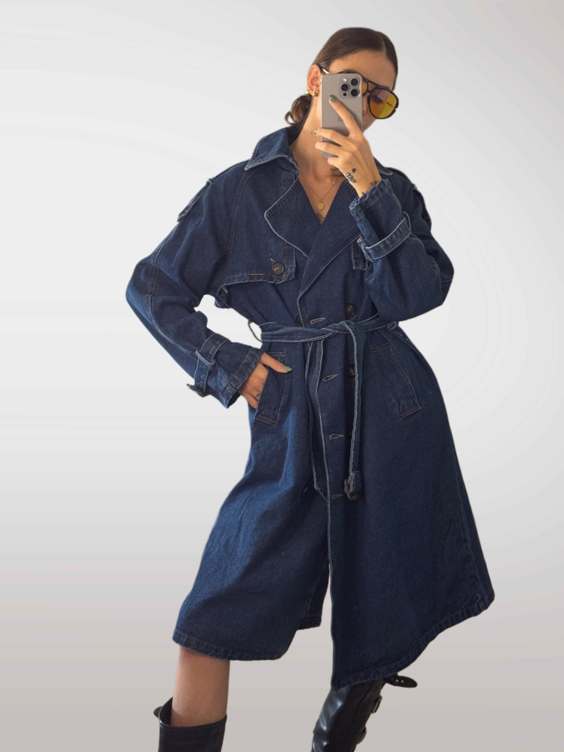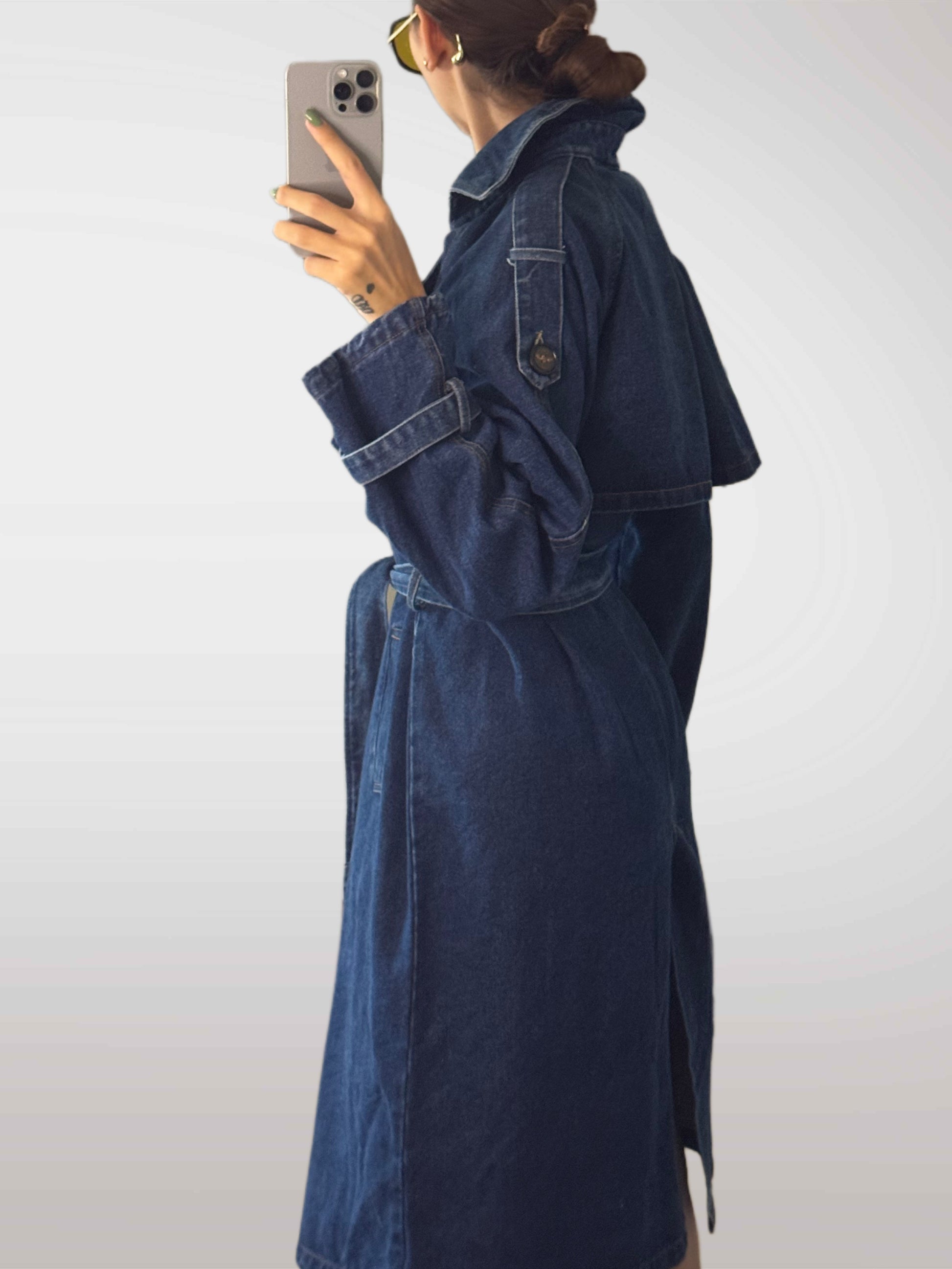 Trench in denim con cintura in vita e tasche laterali funzionali.