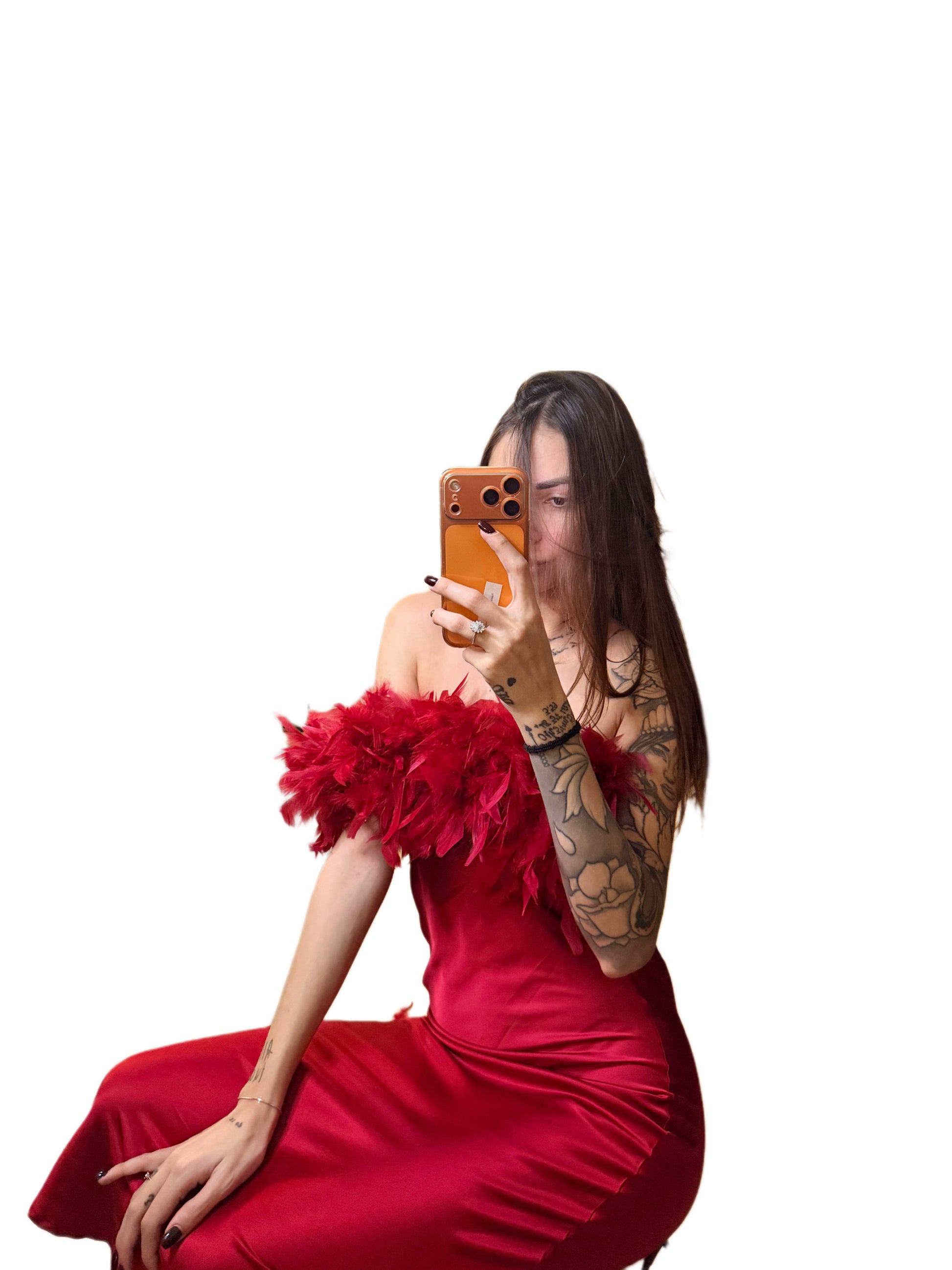 Vestito in raso con piume sul seno,scollo sul retro.